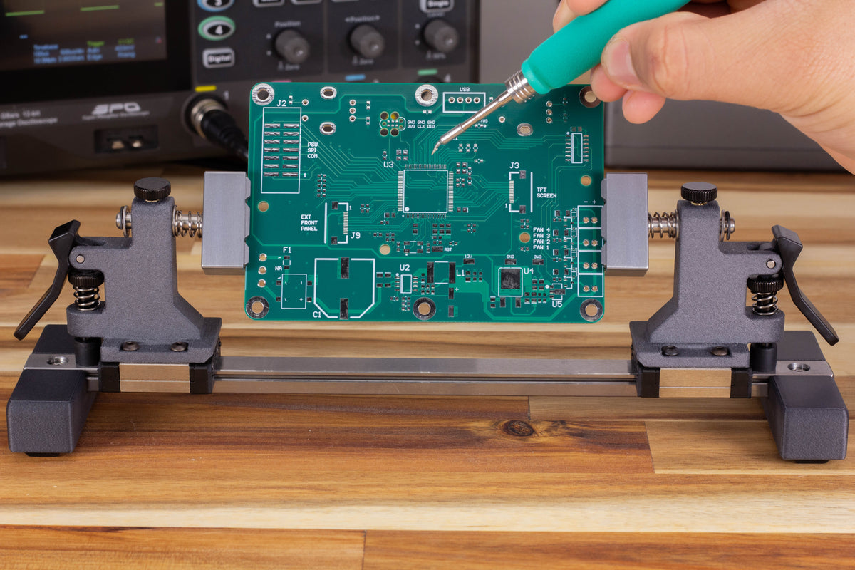 Low-profile rubber feet keep the fixture firmly in place on the workbench, preventing movement during soldering, probing, and rework.